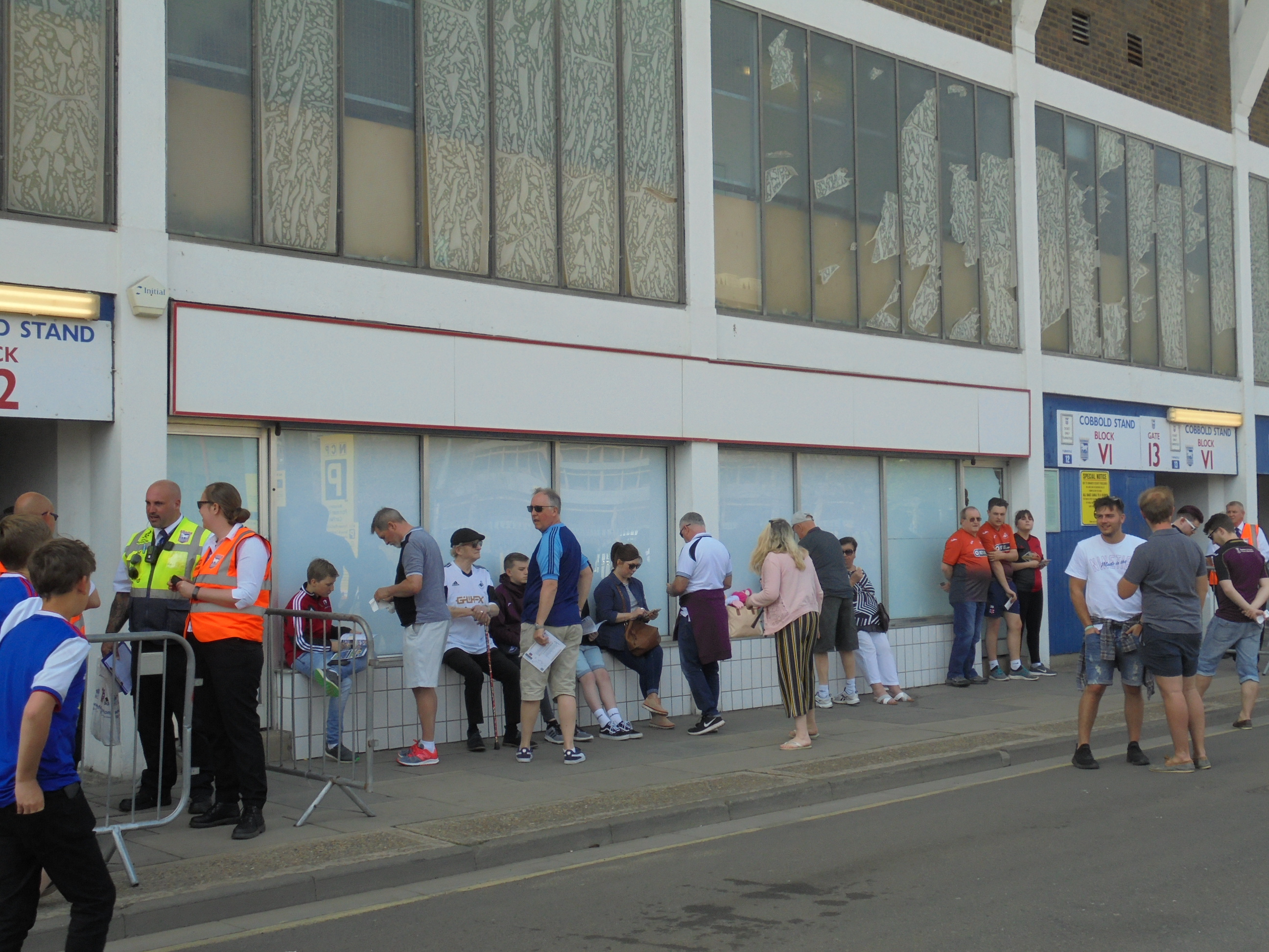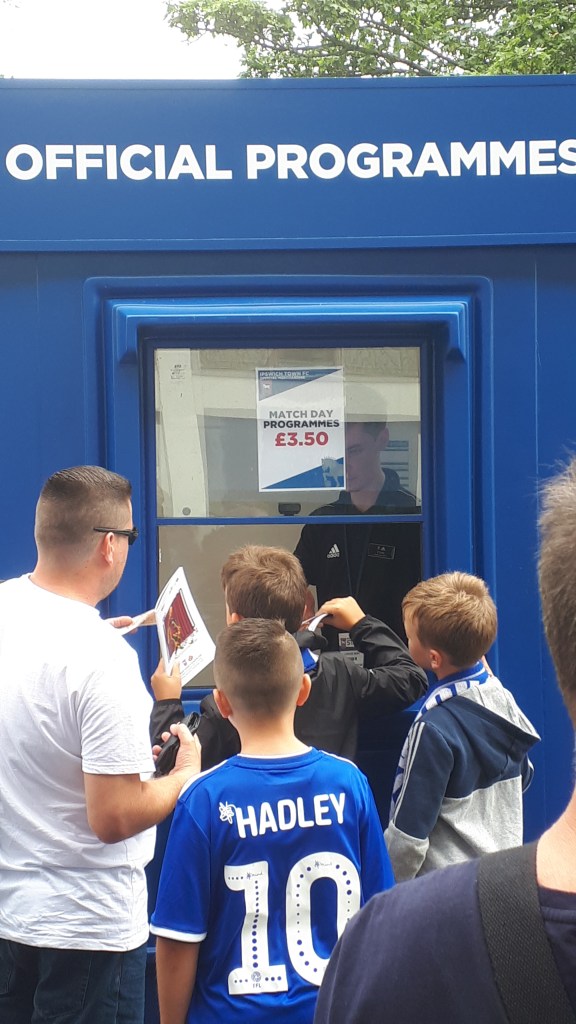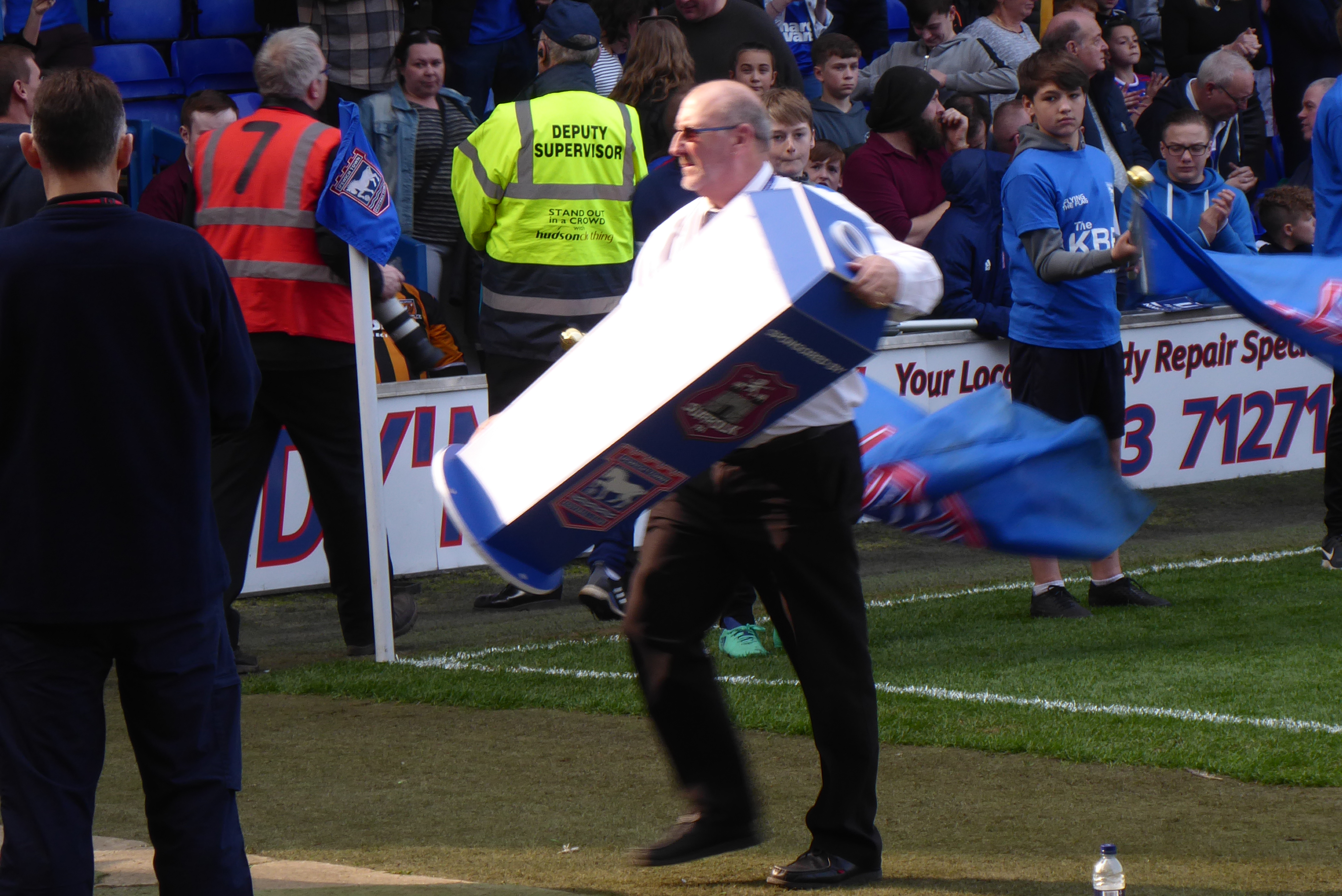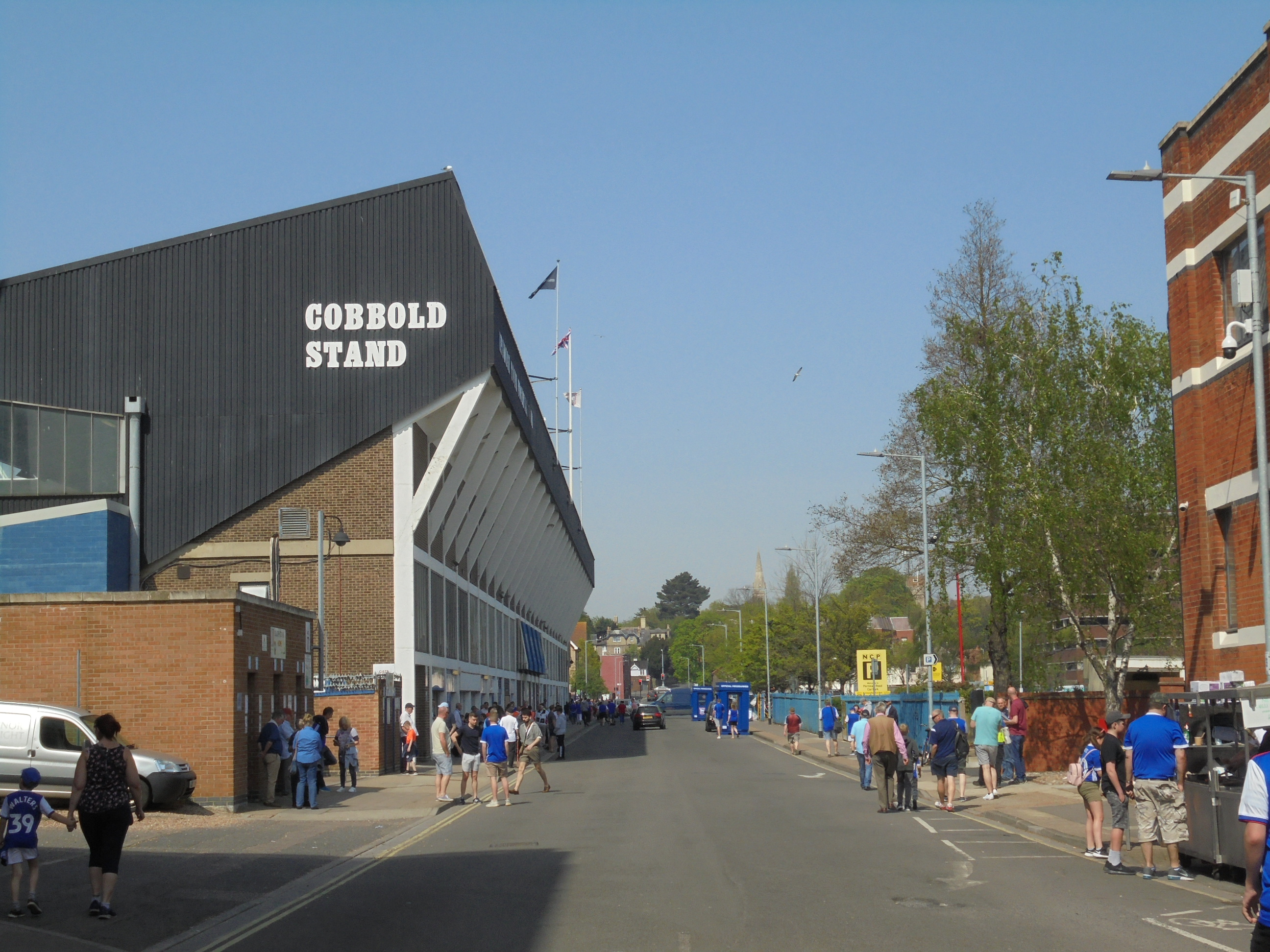 Time passes and eventually with glasses and bladders drained Roly and I descend Portman Road in time for kick-off; the day remains dull and defined by grey cloud. I dodge my way across the stream of supporters flowing out of Portman Road car park and into Sir Alf Ramsey Way; I enter the Sir Alf Ramsey stand through turnstile seven after a brief internal dialogue about which is the luckier number, seven or eight; I decide I don’t believe in lucky numbers. I say a hearty, smiling ‘hello’ to the lady turnstile operator and a little bizarrely also bid her ‘goodbye’ as the turnstile clicks; my excuse is that I am out of practice with this match-going lark, but I am also feeling a lot of love for the world and everyone in it. After another brief visit to the toilet facilities I ascend the steps from the concourse into the lower tier of the stand to reacquaint myself with Pat from Clacton, ever-present Phil who never misses a game, Ray, the old dears who formerly sat behind me, Bluey, Crazee and my view of the green, green turf and its dramatic, part human, part concrete, part blue plastic and steel backdrop.
