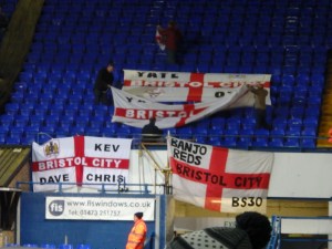 question. Bristol City begin the game, un-necessarily wearing a change kit of white shirts and black shorts when their first kit is all-red; a polyester precis of what is wrong with modern football. Town are kicking towards me , Phil, Ray and Pat from Clacton, and of course wear blue and white and provide their own summary of football’s modern failings with the hideous logo of a gambling company, as ever despoiling the front of their shirts. If Town are relegated this season that logo and choice of an on-line gambling business as sponsor will be partly to blame. There are about ten thousand fewer people here than there were for the last game, but surprisingly the match atmosphere doesn’t seemed diminished by a corresponding 44%. The 13,436 of us here (that excludes the 290 Bristolians) are the hardened rump of Town’s support; we are , I like to think, the ones who care the most and so the sound of our anguish is louder and maybe we breathe more heavily.