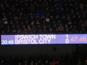 In St Jude’s it’s quiet too, with just four or five other drinkers scattered about as I order a pint of the Match Day Special (£2.50), which tonight is Mr Bee’s Best Beer. I sit and read ‘Unreliable Memoirs’ by Clive James, but with so few people in the bar it’s hard not to overhear conversations. A woman at the bar has a theory that a male friend is gay; something to do with him trying to ‘feel up’ another friend after a night out. No other evidence is put forward, and I don’t learn if the attempt to ‘feel up’ were successful or not. Relief from this gossip arrives in the shape of ever-present Phil who never misses a game; he has arrived hot-foot from Northampton. I’m soon chatting with Phil whilst eating a steak and kidney pie (my first choice, beef and onion was out of stock) and savouring a pint of Cliff Quay Brewery Tolly Roger (pie and a pint £5.00). I don’t like kidney but when I find a bit I just swallow it whole so as not to taste it. We’re not long talking before Mick arrives and he kindly buys me another pint of the Match Day Special whilst also getting one for himself. Phil leaves about ten to seven, which Mick puts down to Keenness but our conversation isn’t diminished, oiled as it is by another pint of the Match Day Special. It is twenty-five to eight by the time I leave Mick at the corner of Portman Road and I only just get to my seat in time for kick-off, therefore missing the match ball being plucked from its plinth as the teams walk out. “What time do you call this?” asks Ray. I don’t have a satisfactory answer other than to give him the correct time, which I sense wasn’t the true purpose of the question. Bristol City begin the game, un-necessarily wearing a change kit of white shirts and black shorts when their first kit is all-red; a polyester precis of what is wrong with modern football. Town are kicking towards me , Phil, Ray and Pat from Clacton, and of course wear blue and white and provide their own summary of football’s modern failings with the hideous logo of a gambling company, as ever despoiling the front of their shirts. If Town are relegated this season that logo and choice of an on-line gambling business as sponsor will be partly to blame. There are about ten thousand fewer people here than there were for the last game, but surprisingly the match atmosphere doesn’t seemed diminished by a corresponding 44%. The 13,436 of us here (that excludes the 290 Bristolians) are the hardened rump of Town’s support; we are , I like to think, the ones who care the most and so the sound of our anguish is louder and maybe we breathe more heavily.